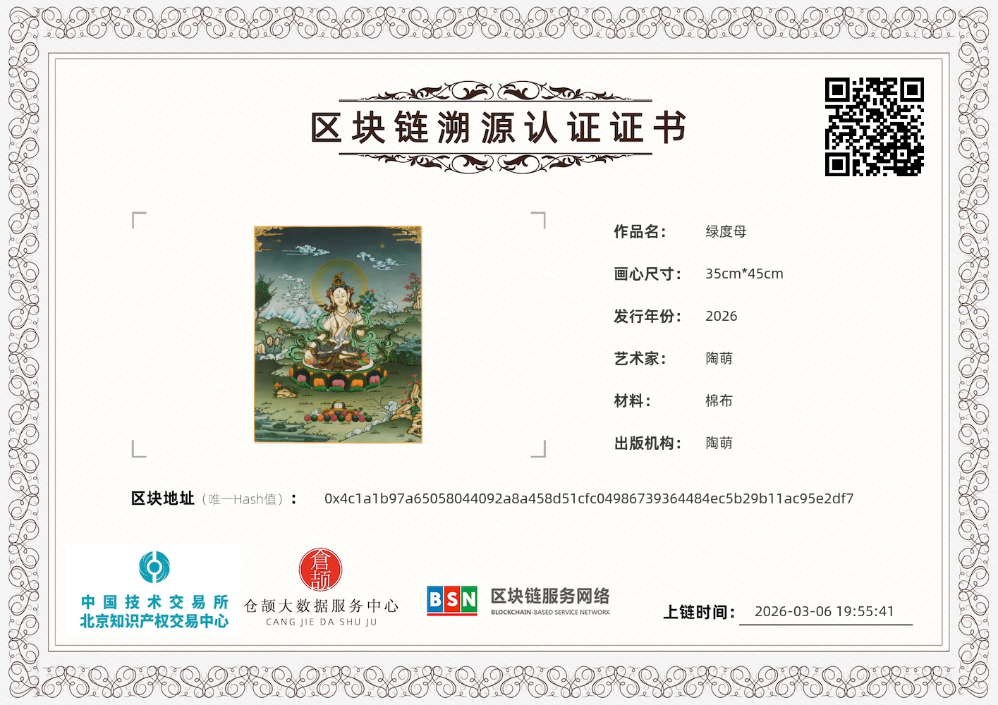 绿度母是藏传佛教中象征慈悲与守护的女神,此唐卡里她呈坐姿,身色翠绿,周身环绕山水祥云,画面色彩浓郁、细节精致,是典型的藏传佛教艺术作品。