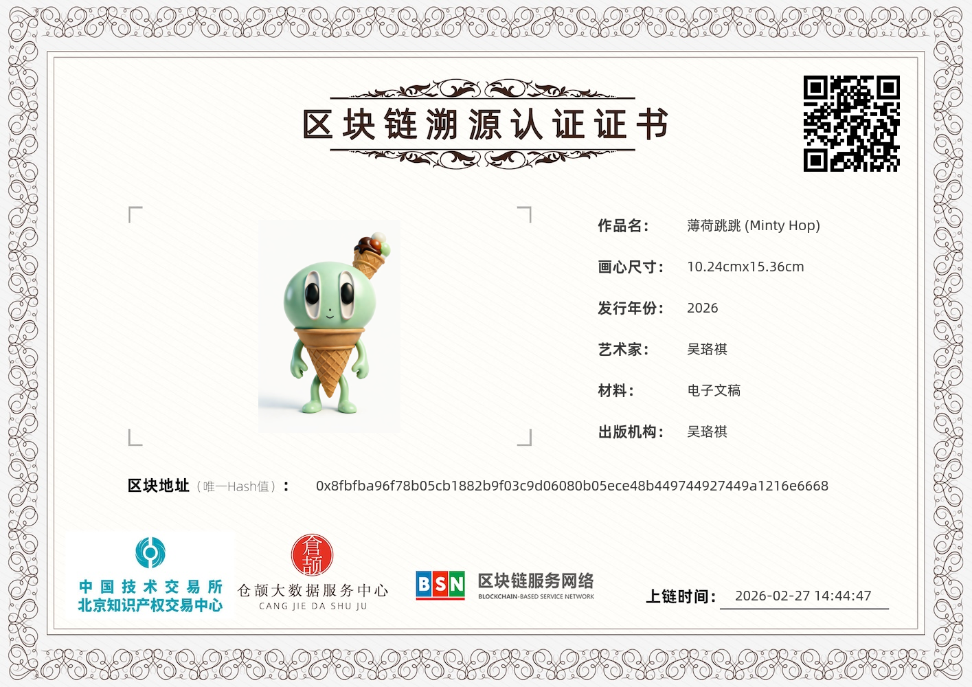 以夏日清凉为核心灵感的治愈系萌宠 IP,将薄荷冰淇淋的清爽特质与 3 岁孩童的活泼贪玩性格结合,塑造出一个怕热、易焦虑却永远充满正能量的 “冰淇淋精灵” 形象,传递出清凉解暑、轻松治愈的情绪内核。 整体采用圆润的薄荷绿色冰淇淋球为主体,搭配经典华夫脆筒作为底座,头顶的巧克力脆皮甜筒既是 “帽子” 也是能量装饰,造型上高度还原冰淇淋形态;夸张的竖椭圆形大眼睛与简单的弯月形嘴巴,生动诠释出其活泼、可爱又带点小笨拙的性格;“跳跃” 与 “擦汗” 的标志性动作,进一步强化了其怕热与活力满满的特质,视觉上清新明快,辨识度极高。 兼具夏日清凉属性与治愈萌感,适配表情包、毛绒玩具、盲盒手办、钥匙扣等多元场景,可围绕其 “怕热的冰淇淋精灵” 人设创作大量日常趣事的动画短片,在清凉治愈与活泼可爱的平衡中,打造一个高亲和力、高传播性的夏日限定 IP。
