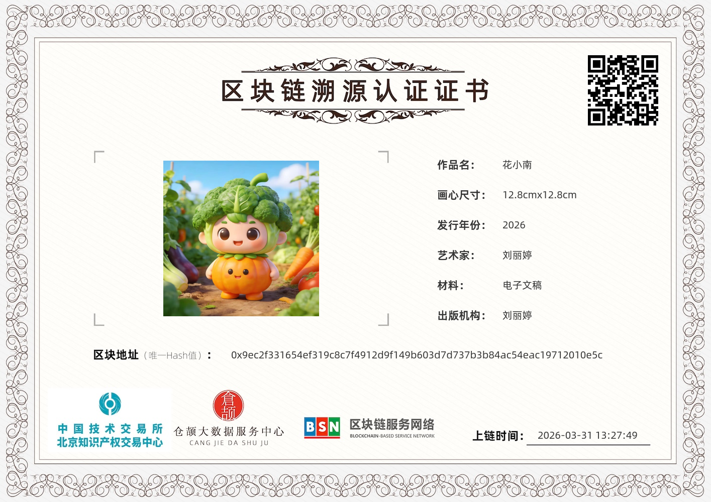 花小南是一个以田园蔬菜为核心灵感的治愈系IP形象,将多种蔬菜元素融合,传递自然、健康与快乐的生活态度。 创作者:刘丽婷 身份证号:445222200608083820