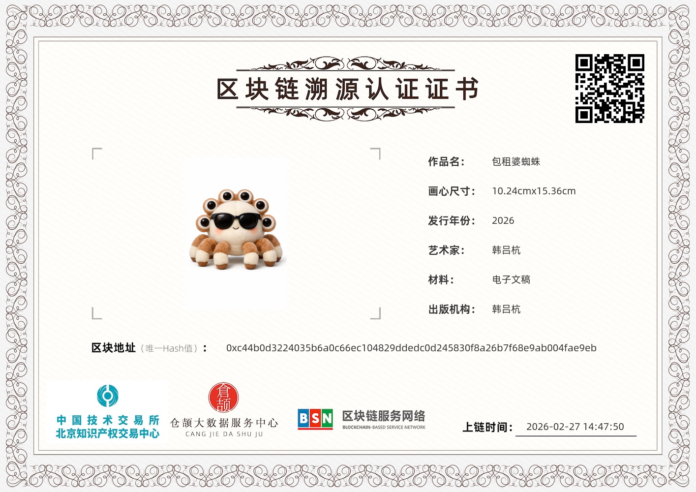 以 “反差萌” 为核心创意,将经典 “包租婆” 的市井泼辣形象与蜘蛛的可爱特质结合,塑造出一个狂放自恋、自称 “宇宙第一” 的 “包租婆蜘蛛” 形象,传递出搞笑、夸张又带点可爱的趣味内核。 整体采用毛绒质感的卡通造型,标志性的八只眼睛与 “包租婆” 的大鼻孔设计形成强烈视觉记忆点,搭配酷炫墨镜,将 “可爱风” 与 “包租婆风” 完美融合;圆润的身形与 “狂放” 的性格关键词形成有趣反差,“自吹自擂” 的爱好与霸气的口头禅,进一步强化了角色的喜剧效果,造型上既独特又极具辨识度。