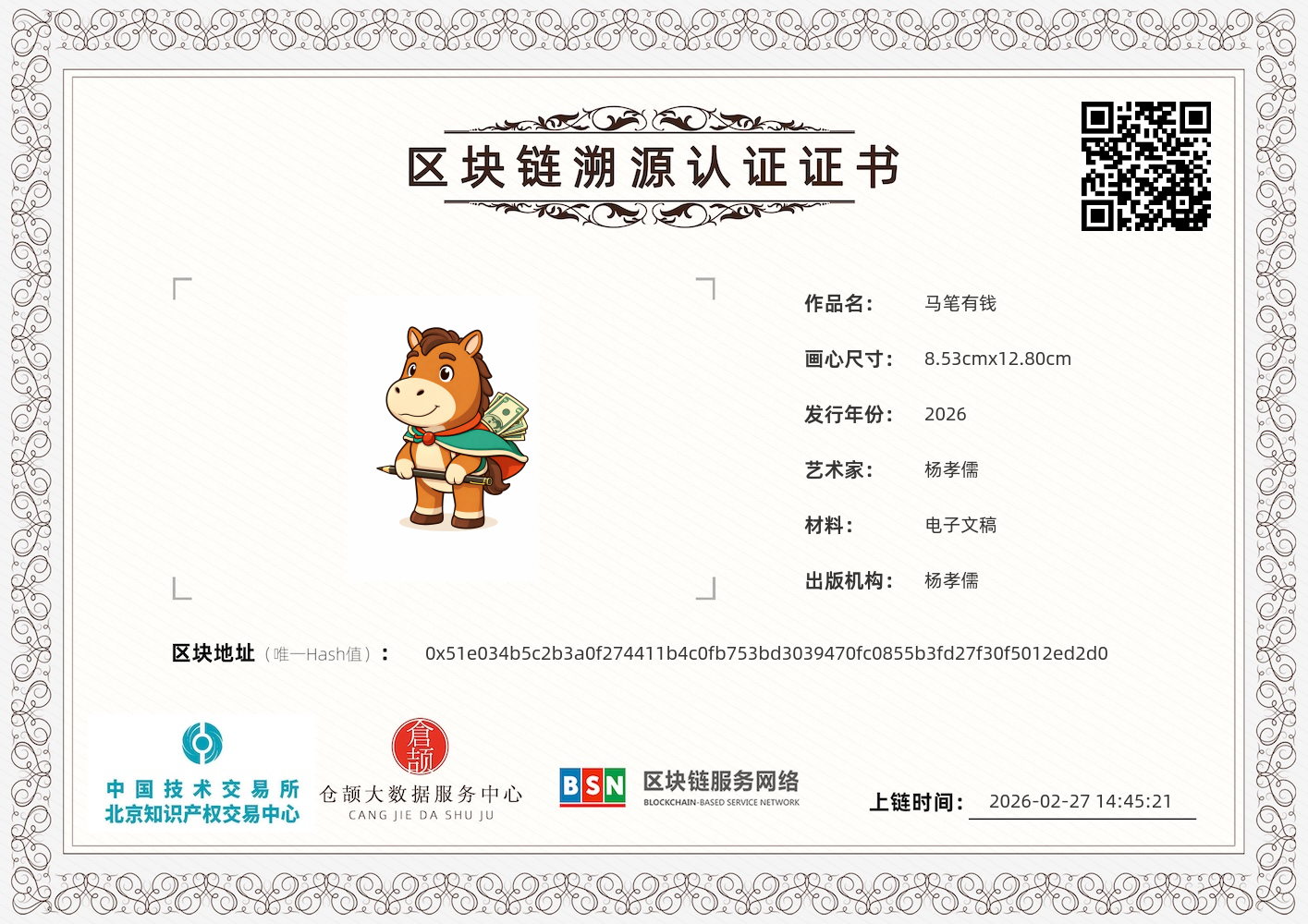 以 “马上有钱” 的吉祥寓意为核心的趣味谐音 IP,将马年的美好祝福与 “马笔有钱” 的谐音梗结合,塑造出可爱向上、自带财运 buff 的萌马形象,传递出招财进宝、积极乐观的核心气质。 整体采用暖棕色调的 Q 版萌马造型,身披绿红披风,手持马笔,背后露出的钞票元素直接点明 “有钱” 的视觉符号;圆润的线条与灵动的神态,凸显其可爱讨喜的性格,马笔与披风的设计既呼应 “马笔” 的谐音,又强化了 “马上发财” 的吉祥寓意,造型直白有梗,辨识度极高。