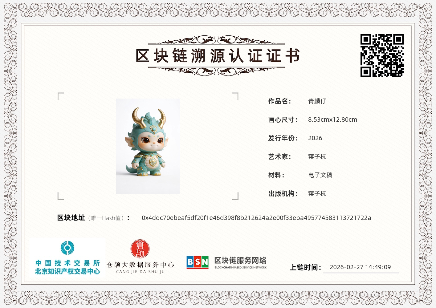 以 “国风萌化” 为核心创意,将传统瑞兽麒麟与 Q 版萌系风格结合,塑造出 5 岁 “软萌小骄傲” 的青麟仔形象,传递出可爱傲娇、自带祥瑞气质的角色内核。 整体采用青蓝为主的国风配色,圆润的身形与精致的金色纹饰,既保留了麒麟的威严感,又增添了软萌可爱的特质;标志性的金色龙角与额间宝石,强化了其瑞兽身份,而 “在云间打滚” 的爱好与 “我最厉害” 的口头禅,则生动诠释了其 “小骄傲” 的性格,造型细节与角色人设高度统一,辨识度极高。
